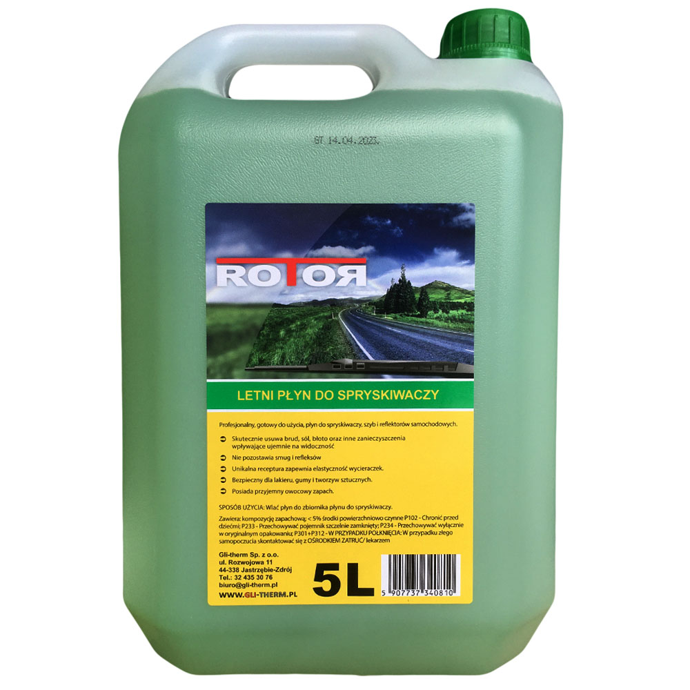 - Rotor płyn do spryskiwaczy letni 5l to wysokiej jakości produkt, który został stworzony z myślą o skutecznym usuwaniu brudu, owadów oraz pyłu z przedniej szyby samochodu w okresie letnim.